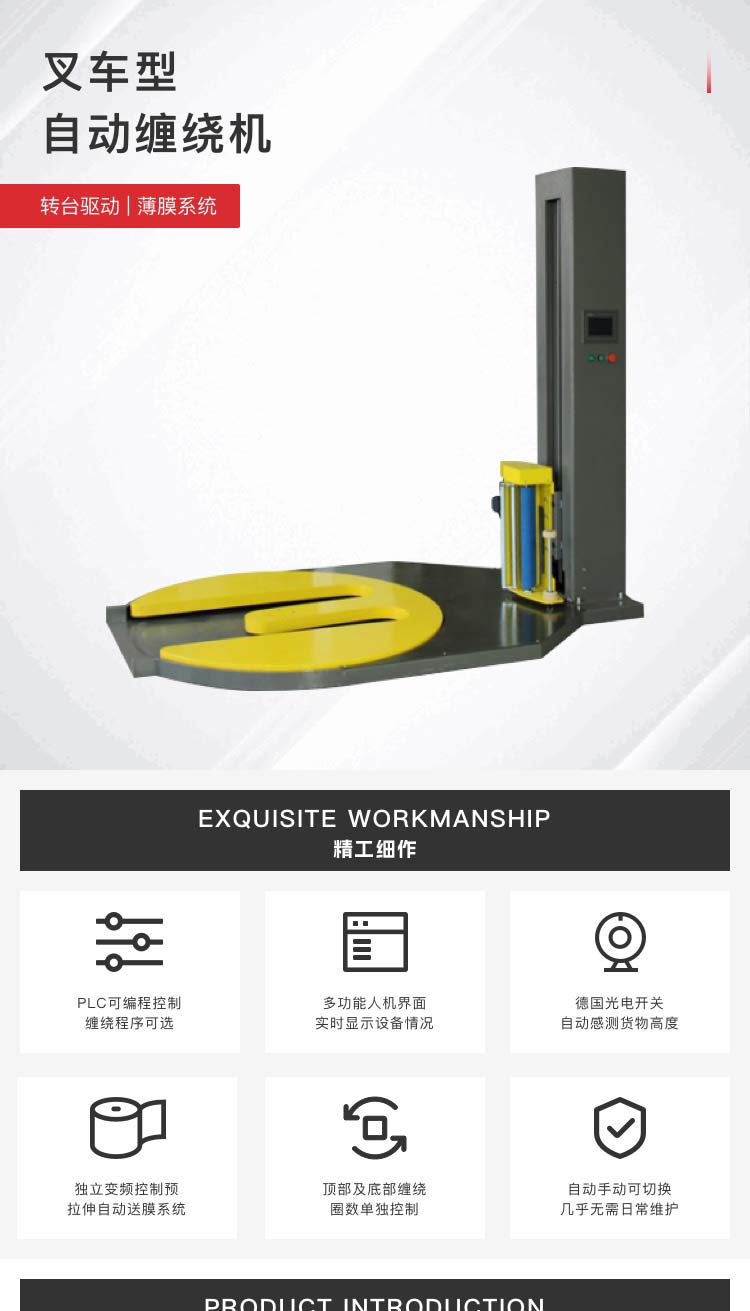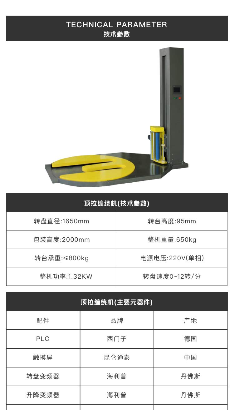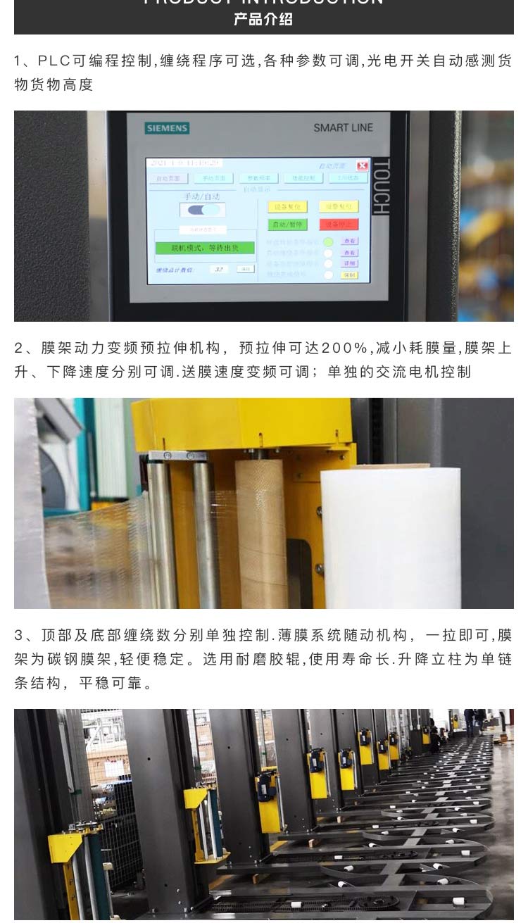介紹:PLC可編程控制,纏繞程序可選。 人機(jī)界面式文本控制顯示系統(tǒng),實(shí)時(shí)顯示設(shè)備運(yùn)行狀況。 德國倍加福光電開關(guān)自動(dòng)感測貨物高度。 纏繞層數(shù)、運(yùn)行速度、薄膜張緊度任意可調(diào),操作方便簡單。 獨(dú)立變頻控制預(yù)拉伸自動(dòng)送膜系統(tǒng),拉力自由調(diào)整。 頂部及底部纏繞圈數(shù)分別單獨(dú)控制,1-9圈自由調(diào)節(jié)。 自動(dòng)、手動(dòng)可切換,幾乎無需日常維護(hù)。