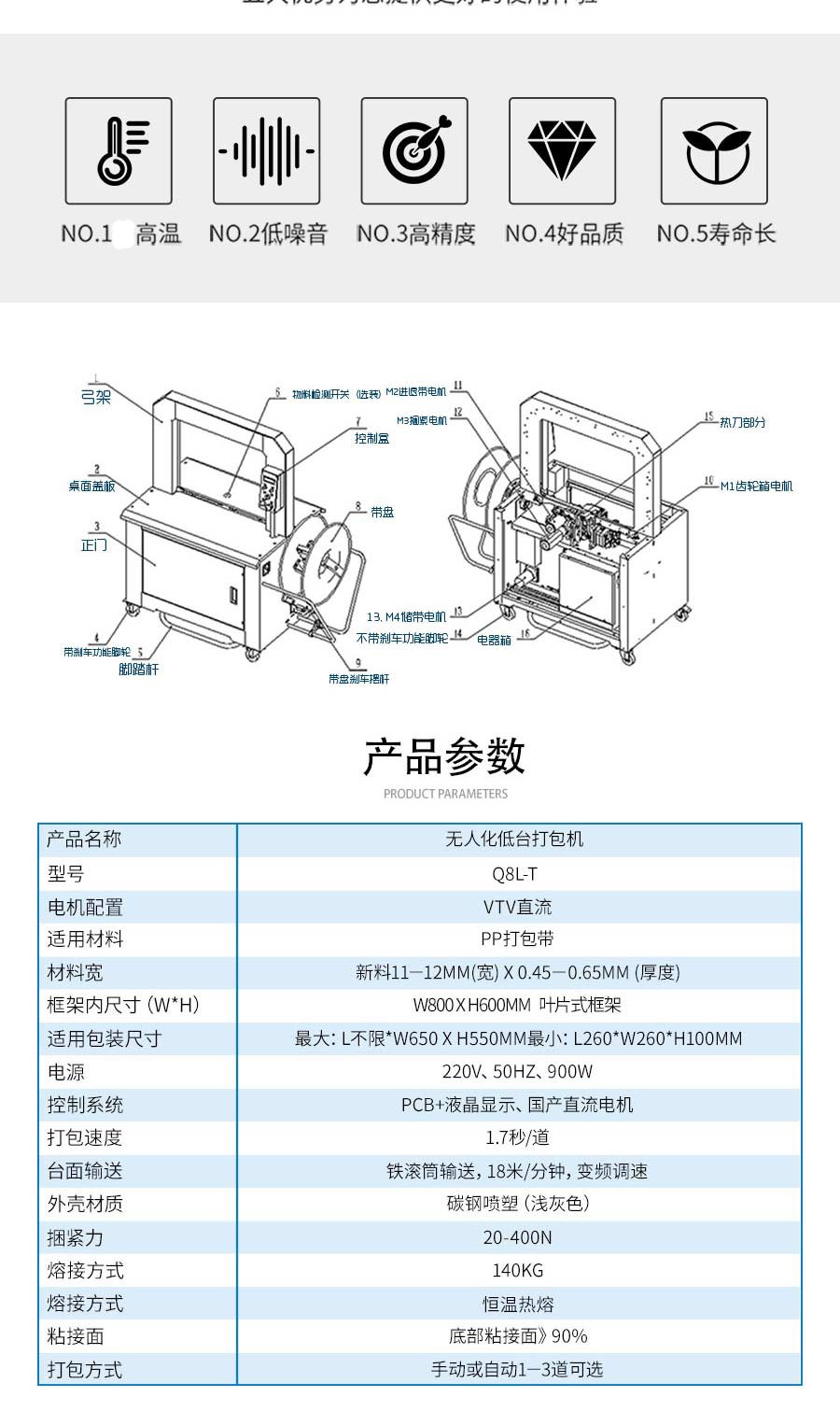 介紹:電機+減速機+凸輪+緊縮臂運作,捆緊力大,故障少,維修方便。 零部件均由電腦微控機床精密加工,機械動作柔和穩(wěn)定,耐久性,功能齊全,使用壽命長。 捆包結束后電機馬上停止運轉,省電實用。 保養(yǎng)容易,免加油,機械堅固,操作簡單。 用途廣泛,可單機操作或配合其他機種,設計自動化與無人化的生產系統(tǒng)。 外型精巧、美觀、節(jié)省空間。 側式設計可避免機器接觸到水或其它污染物 打包機不脫帶,自動送帶 ?
