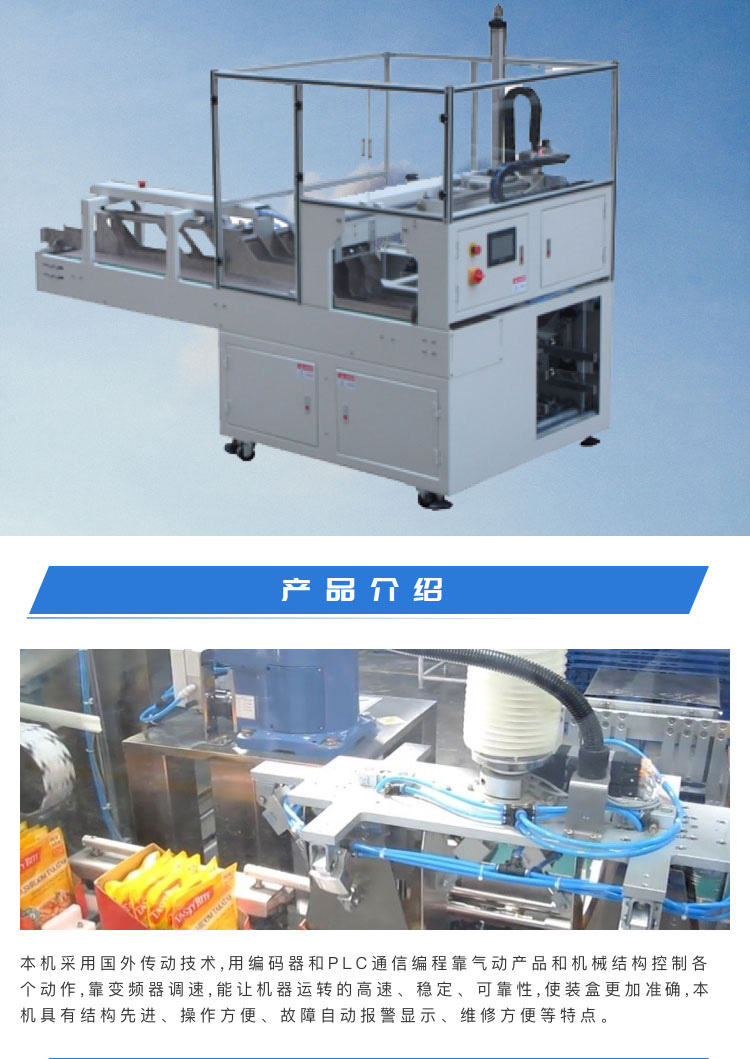 介紹:本機(jī)采用國外傳動技術(shù),用編碼器和PLC通信編程靠氣動產(chǎn)品和機(jī)械結(jié)構(gòu)控制各 個動作,靠變頻器調(diào)速,能讓機(jī)器運(yùn)轉(zhuǎn)的高速、穩(wěn)定、可靠。本設(shè)備可實(shí)現(xiàn)自動下料,開盒,關(guān)盒,黏膠等。 解決您的三大包裝難題實(shí)現(xiàn)自動化生產(chǎn):1、大大降低企業(yè)的生產(chǎn)成本,單臺裝盒機(jī)八小時生產(chǎn)力約為3-5萬盒,按此計(jì)算每臺裝盒機(jī)可省人工為10-15人;2、人工裝盒,易污染、易出差錯.車間多一人,更是多一個污染源.人工裝盒有時會漏裝說明書或內(nèi)容物;3、提高企業(yè)生產(chǎn)力,從企業(yè)管理角度上來講,管理人難,管理設(shè)備易。 產(chǎn)品別稱:裝箱機(jī)、裝盒機(jī)、自動裝箱機(jī)、自動裝盒機(jī)、跌落式裝箱機(jī)、側(cè)推式裝箱機(jī)、抓舉式裝箱機(jī)、機(jī)器人裝箱機(jī)、一片式裹包機(jī)、條形全自動裝盒機(jī)。