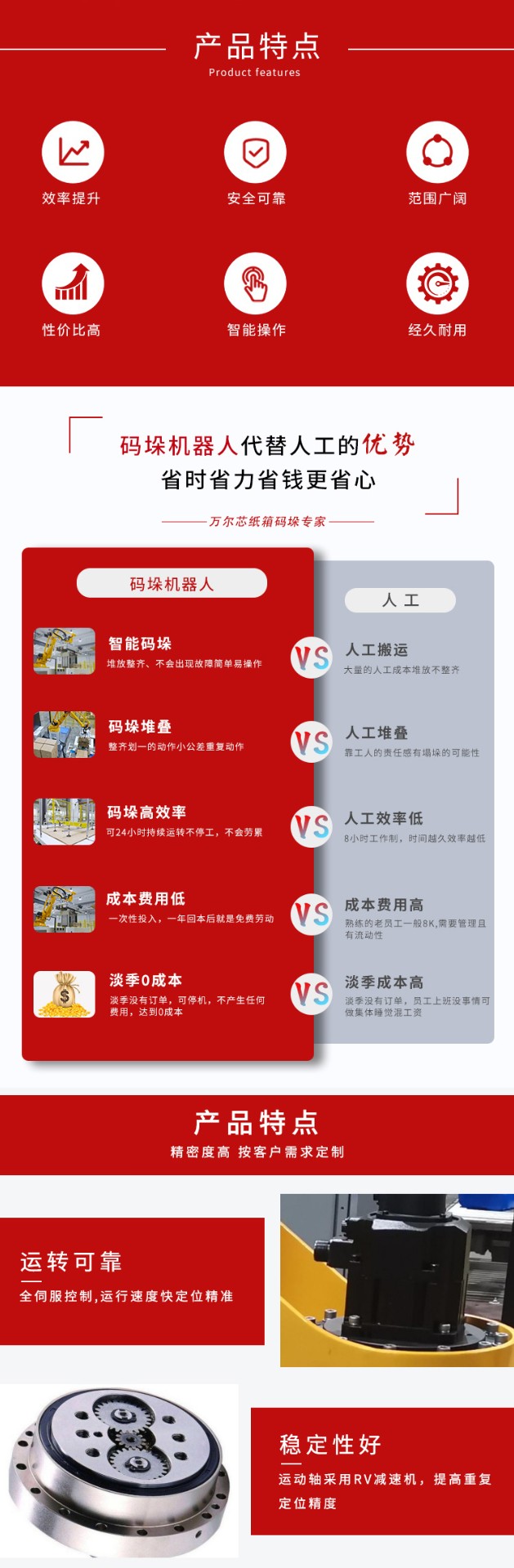 介紹:大型機(jī)械手碼垛機(jī)是一種高度智能化的包裝設(shè)備,主要由大型機(jī)械手臂、先進(jìn)的控制系統(tǒng)、傳感器和夾具組成。它具備強(qiáng)大的抓取能力和承載能力,可以自動(dòng)地完成大規(guī)模產(chǎn)品的抓取、碼垛和放置任務(wù)。大型機(jī)械手碼垛機(jī)通常應(yīng)用于高產(chǎn)、大批量生產(chǎn)的生產(chǎn)線,可以顯著提升生產(chǎn)效率,降低人力成本,同時(shí)保證產(chǎn)品的穩(wěn)定性和包裝質(zhì)量的一致性。這種機(jī)器人碼垛機(jī)廣泛應(yīng)用于各行各業(yè),如物流、汽車、電子、建材等領(lǐng)域,為企業(yè)實(shí)現(xiàn)智能化、自動(dòng)化生產(chǎn)提供了有力支持。其先進(jìn)的技術(shù)和靈活性,使其成為現(xiàn)代化生產(chǎn)線不可或缺的重要設(shè)備。
