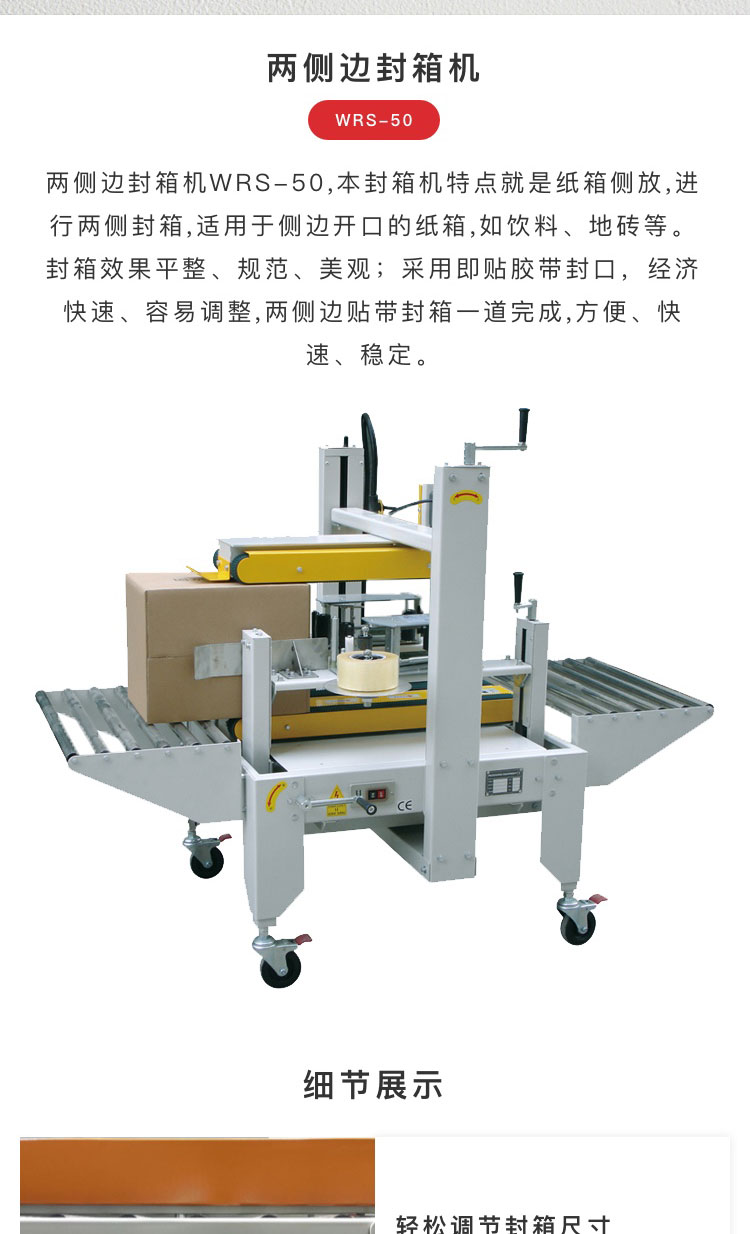 介紹:兩側(cè)邊封箱機(jī)WRS-50,本封箱機(jī)特點就是紙箱側(cè)放,進(jìn)行兩側(cè)封箱,適 用于側(cè)邊開口的紙箱,如飲料、地磚等。封箱效果平整、規(guī)范、美觀;采用 即貼膠帶封口,經(jīng)濟(jì)快速、容易調(diào)整,兩側(cè)邊貼帶封箱一道完成,方便、 快速、穩(wěn)定。 產(chǎn)品別稱:全自動封箱機(jī)、工字封箱機(jī)、一字封箱機(jī)、十字封箱機(jī)、四角邊封箱機(jī)、上下驅(qū)動封箱機(jī)、左右驅(qū)動封箱機(jī)、快遞封箱機(jī)、電商封箱機(jī)、膠帶封箱機(jī)、快速封箱機(jī)、可調(diào)封箱機(jī)、伺服封箱機(jī)